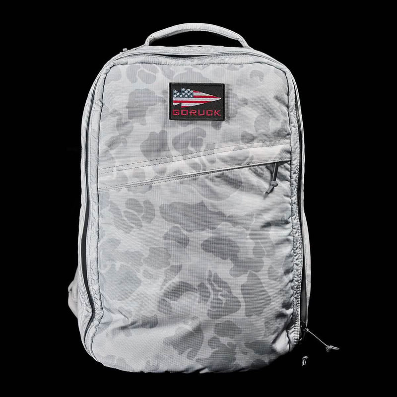 Introducing the GR1 USA - Ripstop ROBIC® by GORUCK, a gray camo-patterned rucksack equipped with a handy handle and a convenient front zippered pocket. It includes a distinctive black patch adorned with an American flag design and the word
