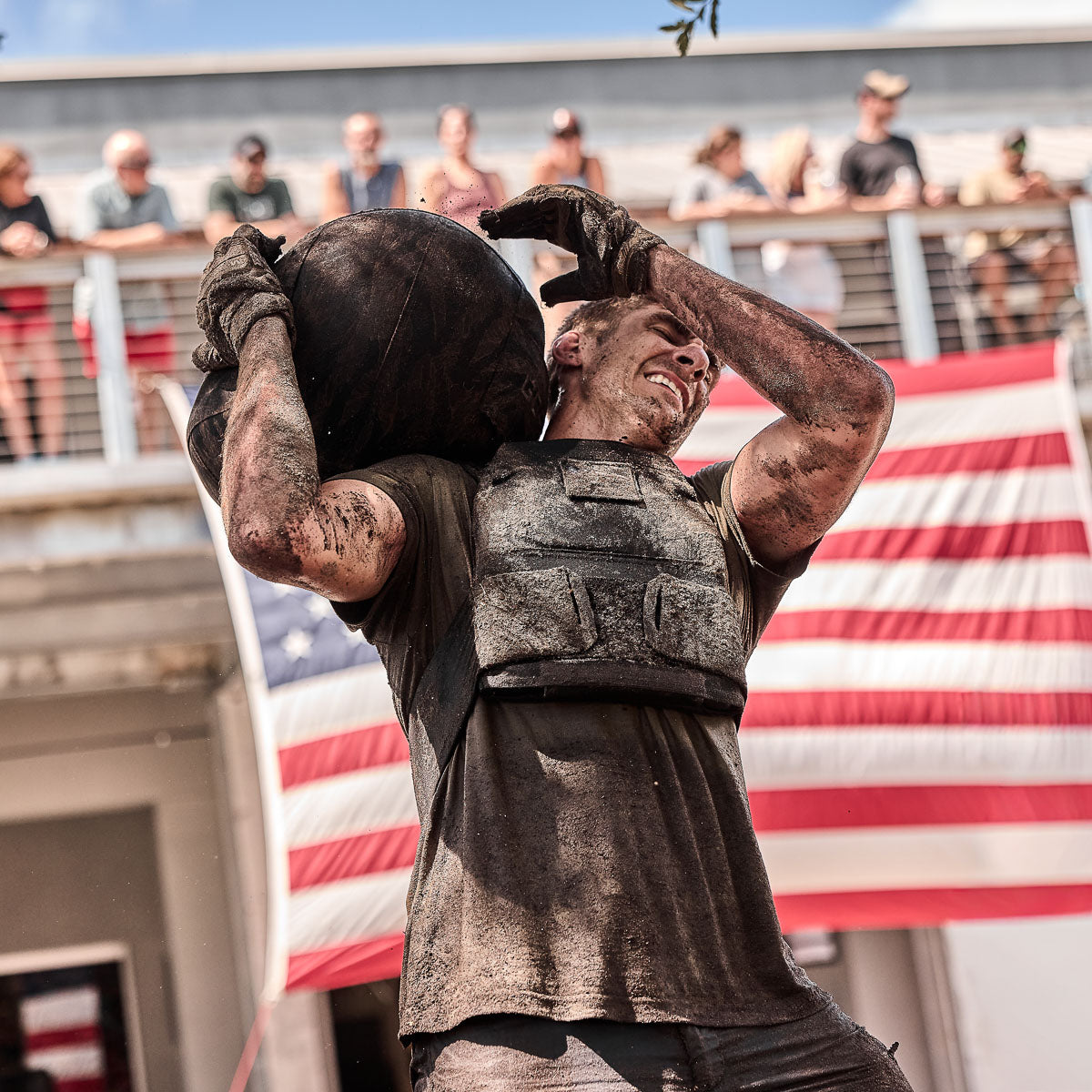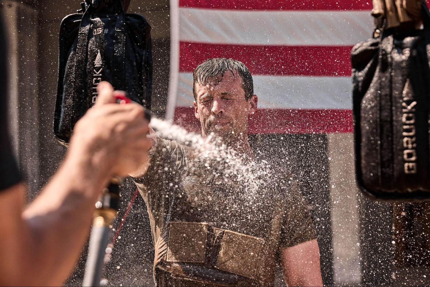 A man wearing the Rucking Weight Vest and wet tactical gear stands before a large American flag, as onlookers watch from above.