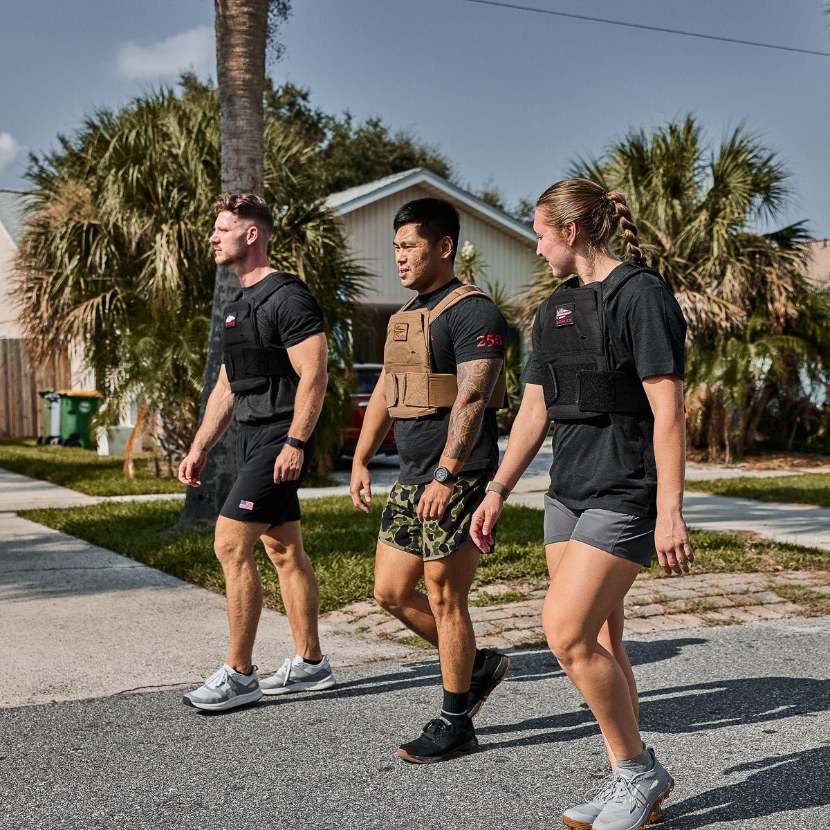 Two people wearing Rucking Weight Vests with Curved Ruck Plates carry sandbags on their shoulders while rucking outdoors.