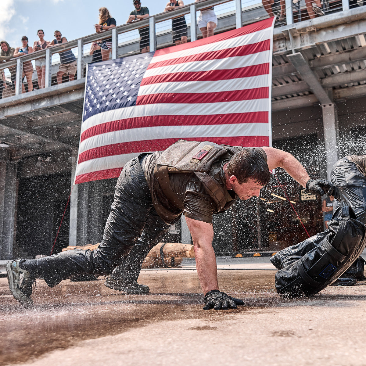 A man wearing the Rucking Weight Vest and wet tactical gear stands before a large American flag, as onlookers watch from above.
