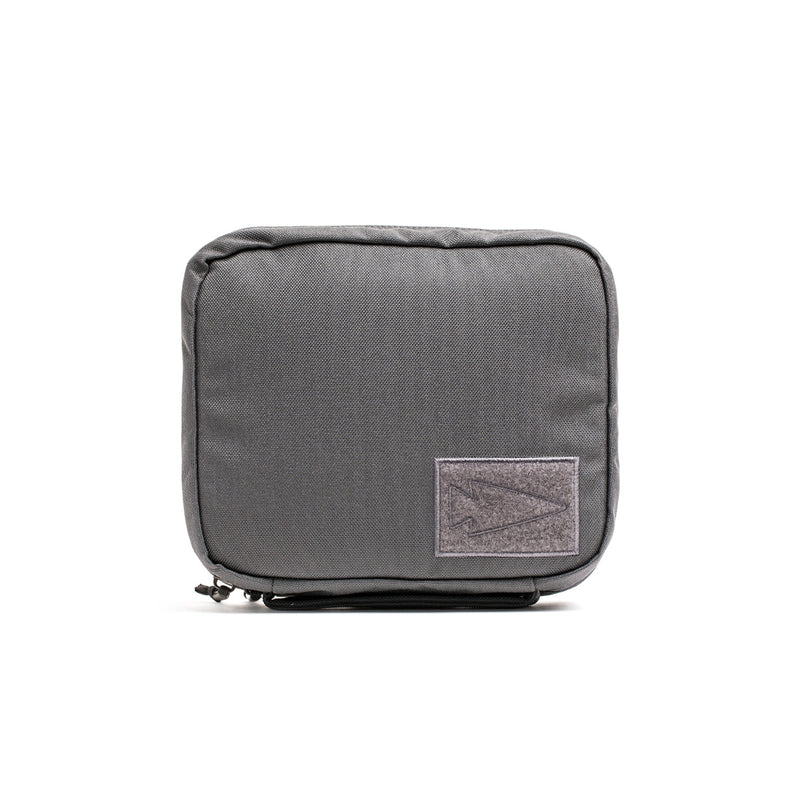 The GR2 Field Pocket is an open, gray travel pouch made from durable 1000D Cordura, featuring mesh compartments and zippers on each side.