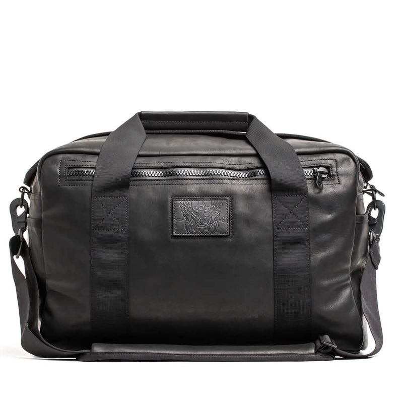 The Kit Bag x Carryology - Berserker Viking by GORUCK is a sleek, black leather duffel bag designed with sturdy handles and a detachable shoulder strap, evoking the essence of a modern Viking kit bag. It includes a front zipper pocket and a rectangular brand patch, offering a stylish and professional appearance suitable for today's Norsemen warriors.