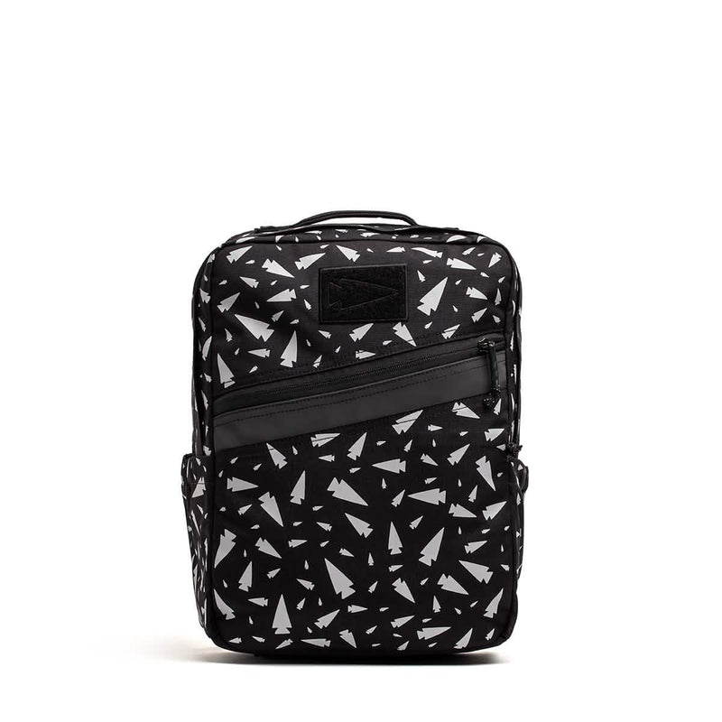 Introducing the KR1 - Spearhead Splatter from GORUCK, a sleek and modern black kids' rucksack. It features padded shoulder straps and displays a geometric white arrow pattern. This book bag comes with a quilted back panel for added comfort and has several visible side straps for easy adjustments, making it perfect for carrying school supplies.