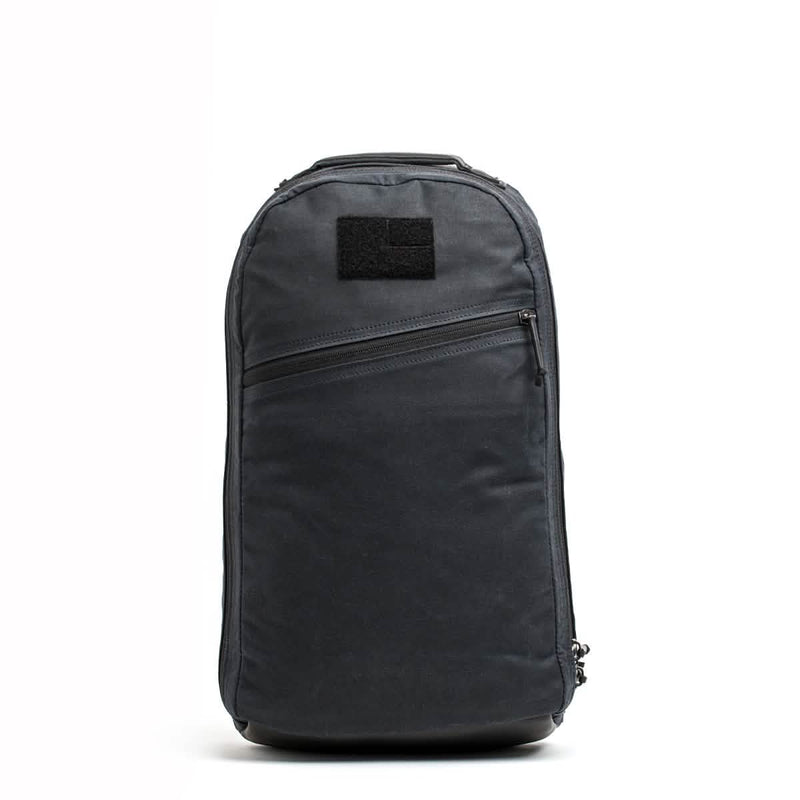A sleek Bullet Ruck - Waxed Canvas backpack by GORUCK, with a minimalist design in dark gray, is showcased against a plain white background. It includes a front zip pocket and a small Velcro patch near the top.