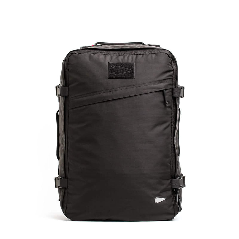 Introducing the GR3 - Ripstop ROBIC® by GORUCK: a sleek black carry-on rucksack with a rectangular design, constructed from robust Robic nylon. It includes multiple zippers, side buckle straps, and a small triangular logo prominently displayed on the top front—perfect for travel or outdoor adventures.