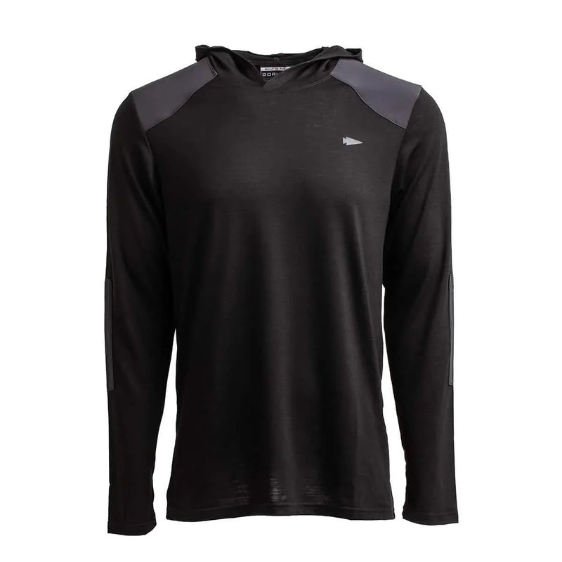 GORUCK black hoodie front view, long sleeves, reinforced shoulders, athletic rucking gear