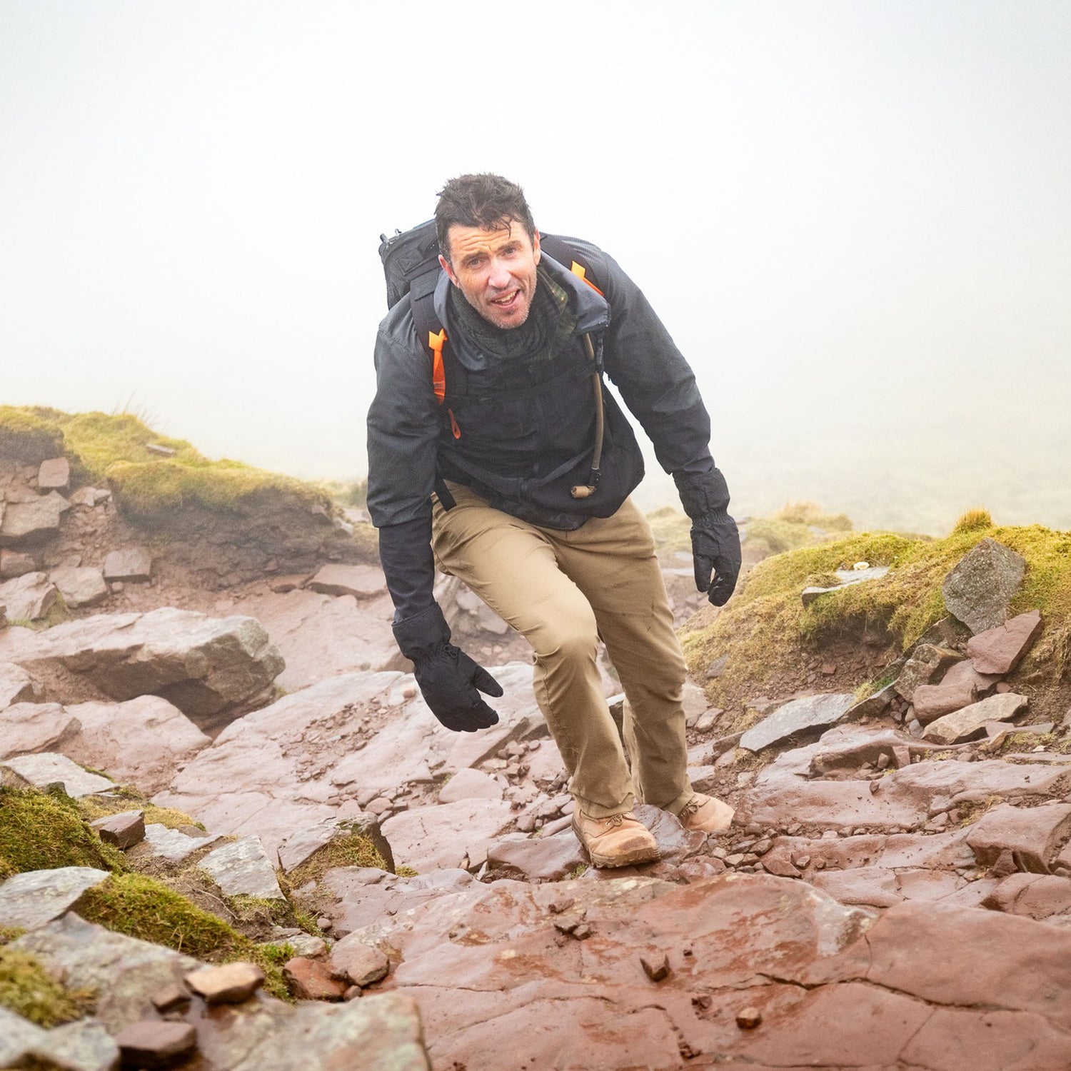 Wearing Merino Compression Socks, a man hikes uphill on a foggy trail, leading a group of hikers behind him.