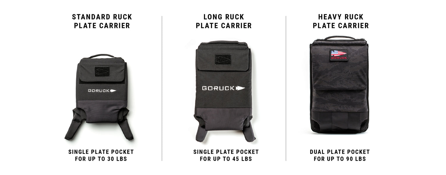 The Ruck Plate Carrier (Standard) is ideal for carrying 10LB, 20LB, or 30LB Standard Ruck Plates. It’s the perfect place to start if you’re new to rucking or want to add some extra suck to your workouts. The Ruck Plate Carrier (Long) fits a 30LB Long or 45LB Long plate and is ideal if you’re a larger guy. The Ruck Plate Carrier (Heavy) carries up to two 45LB plates (or a 45 + a 30 Long, etc.) for your toughest rucks.