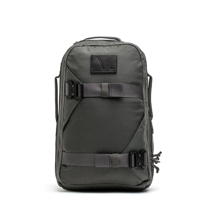 The Skate Ruck is a dark gray EDC bag with front buckles, side handles, a rectangular patch near the top, and a bombproof laptop compartment for enhanced protection.