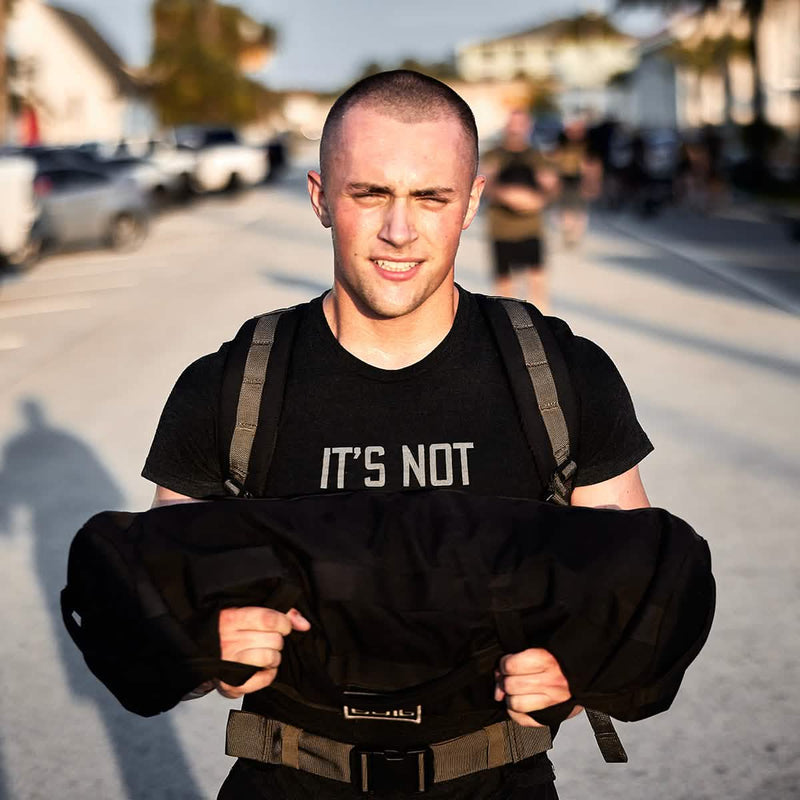 A person with a shaved head, clad in a black T-shirt, is taking part in GORUCK's Teen/Preteen Ruck Training Program by hoisting a sandbag over their shoulder. They confidently stride down the street surrounded by parked cars and passersby, proudly demonstrating their commitment to strength and conditioning.