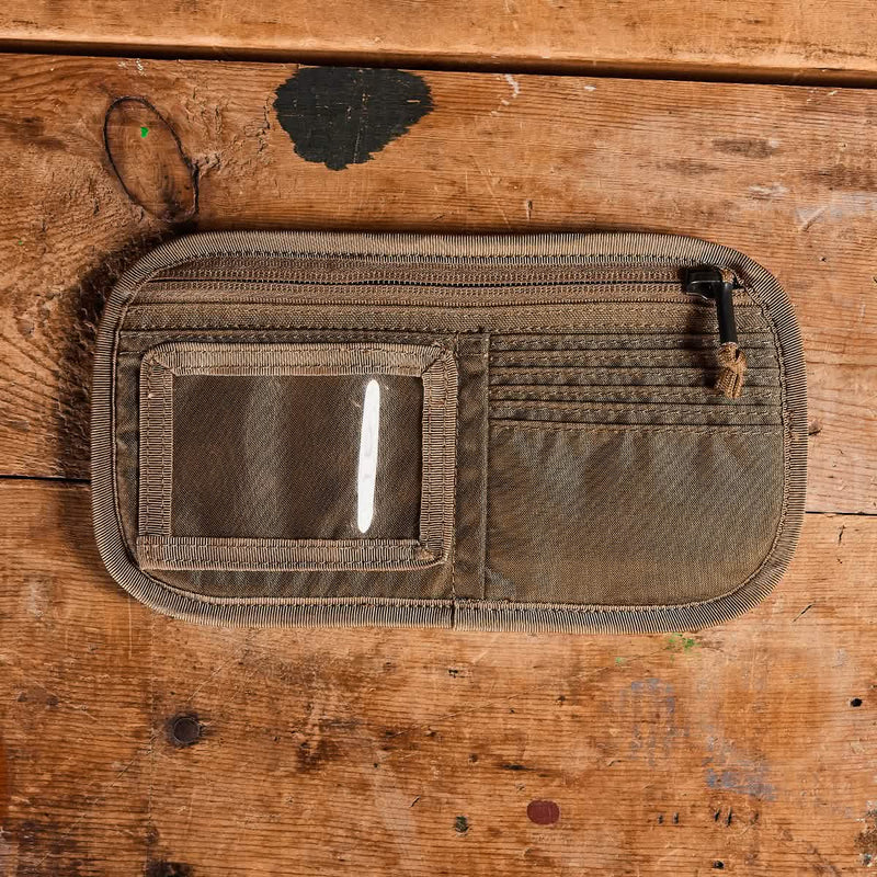 Introducing the GORUCK Admin Panels: a sleek black fabric wallet featuring a zippered compartment and multiple card slots, ideal for travel or EDC. It is showcased on a textured wooden surface.
