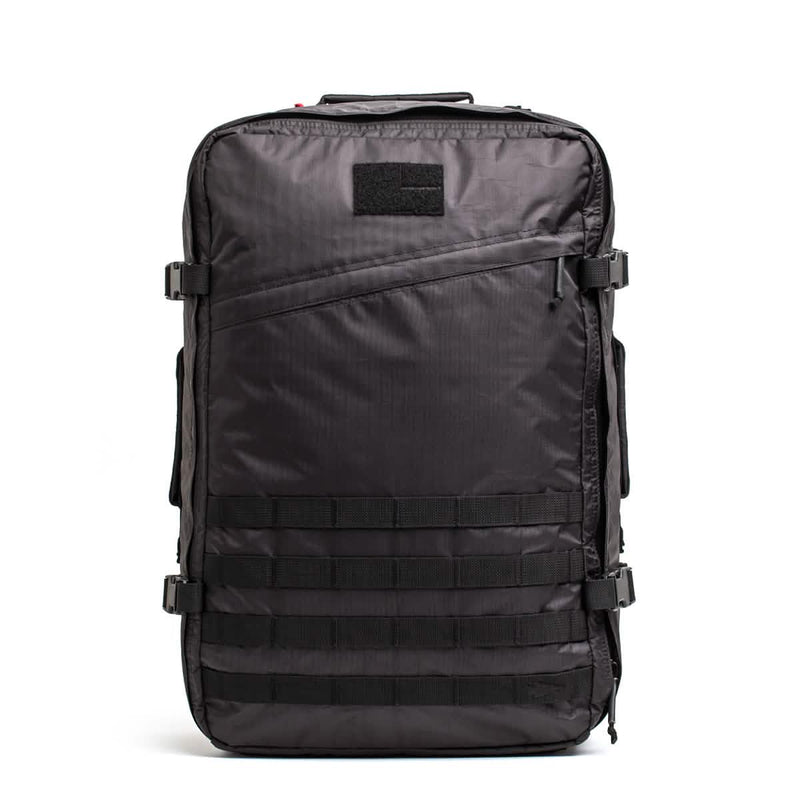 Introducing the GR3 - Dyneema by GORUCK: a black tactical carry-on backpack with a sleek rectangular shape and multiple compartments. It boasts adjustable straps, MOLLE webbing on the front, and a convenient small patch area at the top. Crafted with durable Dyneema material, this backpack is both stylish and functional for various outdoor activities.