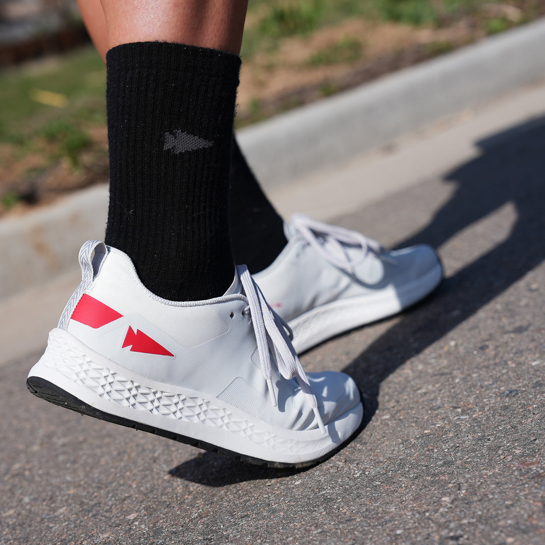 Typical running shoes on the market use what we’ll call “marshmallow foam” under your foot. It’s squishy and soft. Like a waterbed, it might feel good for a bit, but it’s terrible for your body. Marshmallow foam also compresses very quickly, even when it’s high quality, which makes your shoes feel “dead” much faster. What that does is that it encourages you to buy more shoes. That’s fine for some, but we wanted to build a stable platform under your foot, too — good for high mileage and all the other things (not just running) that you want to do with your life.